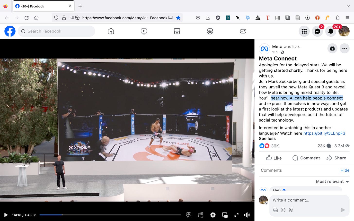 Guess answer: Mark Zuckerberg stands on stage in front of a huge screen showing a violent fist-fight between 2 men in a wire cage. Cage Warrior franchise bright lights, an XStadium logo in lower right of screen. One fighter has just been knocked down and cowers protecting his head, the other stands belligerently over him. In the foreground, a referee counts down to knockout. Zuckerber speaks about how he is “into fighting”, and is excited by being able to watch it in new immersive “180 degree 4K resolution”.